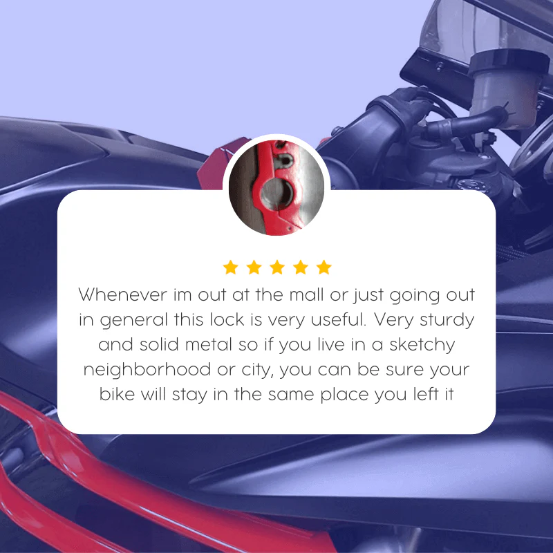 "The Turbo Motorcycle Lock is compact and easy to apply/remove. It’s great for securing your motorcycle for long or short periods. I love it! Ordering one more!!!"